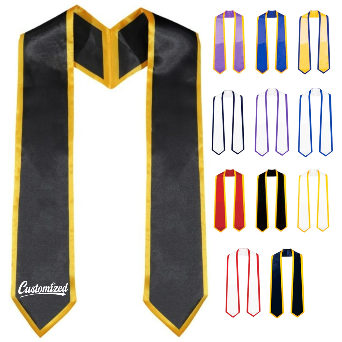 Additional InformationShiny satin graduation stole with contrast trim. Ideal for academic ceremonies, student honors, and commemorative branding.